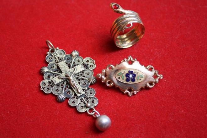 En haut de l'image, pince de châle ou de foulard, et en bas de l'image paire de pendants d'oreille, modèle traditionnel, il leur manque leurs parties hautes (collection particulière)